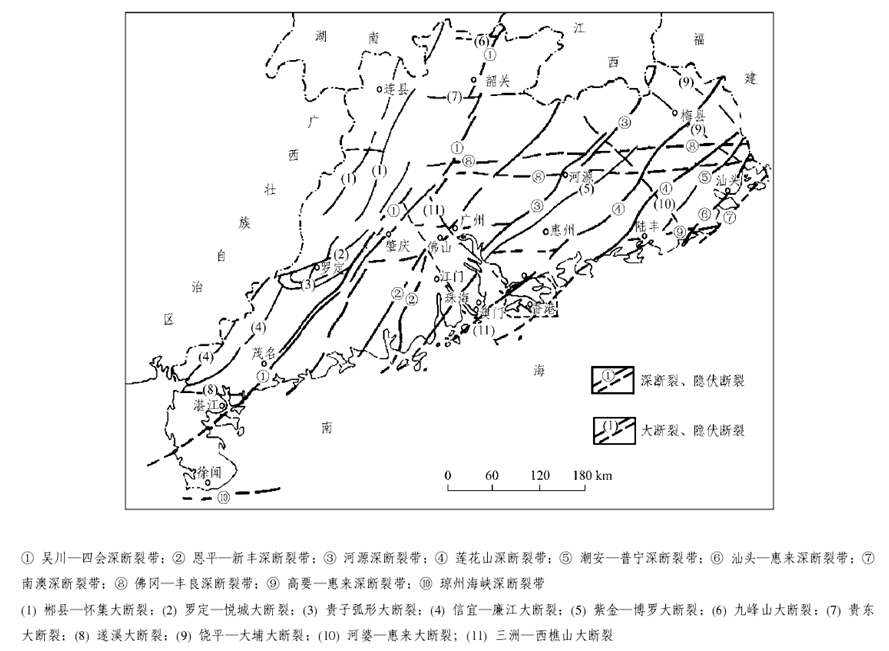 廣東省在大地構(gòu)造上屬華南褶皺系的一部分,其演化過程經(jīng)歷了三個(gè)發(fā)展階段及相應(yīng)的構(gòu)造旋回和構(gòu)造運(yùn)動(dòng):加里東運(yùn)動(dòng)形成緊密線型褶皺,主要呈NEE方向,成為廣東省構(gòu)造骨架的基礎(chǔ);印支運(yùn)動(dòng)形成多方向的過渡型蓋層褶皺;燕山運(yùn)動(dòng)以斷塊造山、NE向和EW向深大斷裂控制的火山噴發(fā)、巖漿侵入為主。深大斷裂對(duì)廣東省的沉積建造、巖漿活動(dòng)、變質(zhì)作用和成礦作用有較明顯的控制。主要的深斷裂有吳川-四會(huì)、恩平-新豐、河源、蓮花山、潮安-普寧、汕頭-惠來、南澳、佛岡-豐良、高要-惠來、瓊州海峽等,主要的大斷裂有郴縣-懷集、羅定-悅城、貴子、信宜-廉江、紫金-博羅、九峰山、貴東、遂溪、饒平-大埔、河婆-惠來、三洲-西樵山等。這些深大斷裂都具有規(guī)模大、活動(dòng)時(shí)間長等特點(diǎn)。從總體上看。廣東省境內(nèi)大型褶皺和深大斷裂以NE向?yàn)橹鳎g夾EW向和NW向構(gòu)造組成復(fù)雜的構(gòu)造圖景。