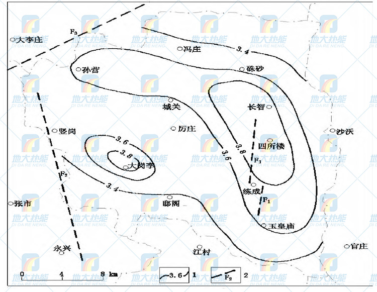 根據(jù)地溫梯度計算, 500 m埋深地溫變化范圍32~35℃, 1000 m埋深地溫變化范圍48~54℃。500 m埋深大于34℃的高溫區(qū)及1000 m埋深大于52℃的高溫區(qū)主要分布在長智-四所樓-練成-玉皇廟及大崗李一帶。地溫垂向上隨地層深度增加而增大, 300~500m深度為25~35℃;500~700 m深度為31~40℃;700~1000 m深度為40~53℃;推算1400 m深度地溫達(dá)60℃左右。