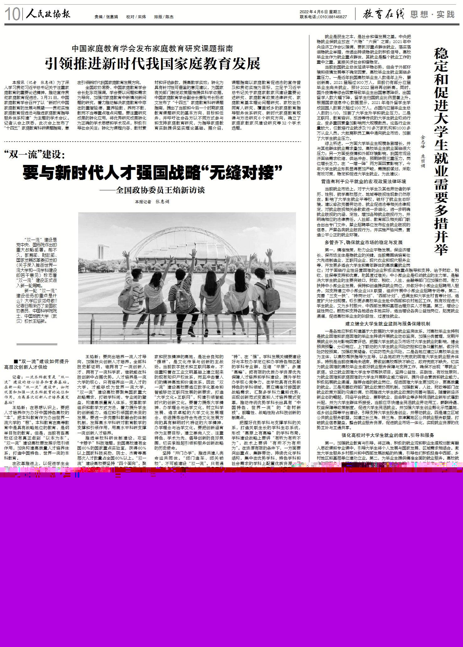 王焰新:在思想認(rèn)識上,要把人才培養(yǎng)作為辦好中國特色高校的“本”,把本科教育作為辦出世界一流大學(xué)的“根”。本科教育在高等教育中是具有戰(zhàn)略地位的教育、是綱舉目張的教育。但是,當(dāng)前有些高校還沒有真正做到“以本為本”。“雙一流”建設(shè)高校要發(fā)揮示范引領(lǐng)作用,加快構(gòu)建高質(zhì)量人才培養(yǎng)體系,打造中國特色、世界一流的本科教育。