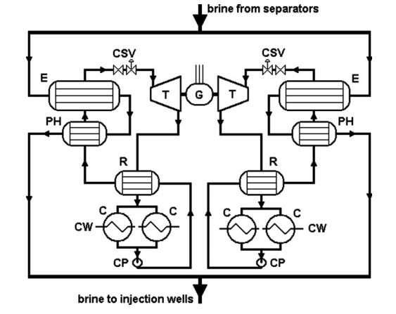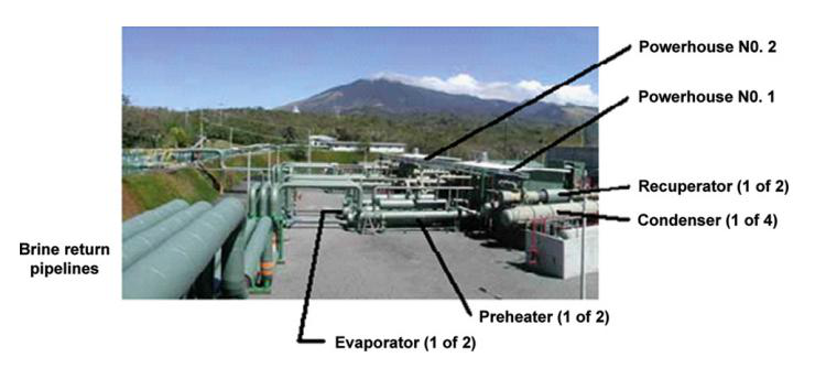米拉瓦列斯的五號(hào)發(fā)電機(jī)組是2004年剛投入使用的。這個(gè)發(fā)電機(jī)利用從一號(hào)和二號(hào)和三號(hào)發(fā)電機(jī)組中的廢棄鹵水,通過注入井來獲取了可能回到熱儲(chǔ)層中的能量。總共的發(fā)電量是15.5MW,發(fā)電機(jī)組中的每一個(gè)發(fā)電單元都發(fā)出7.75MW的電。每一個(gè)發(fā)電單元是有兩個(gè)渦輪組成的,驅(qū)動(dòng)同一個(gè)發(fā)電機(jī)。循環(huán)工質(zhì)是常規(guī)的正戊烷,C5H12。每一個(gè)單元用兩個(gè)預(yù)熱器。兩個(gè)蒸發(fā)器跟他們各自的分隔板。兩個(gè)回?zé)崞鳎膫€(gè)水冷凝器。這個(gè)發(fā)電機(jī)組是有澳瑪特(Ormat)提供的。