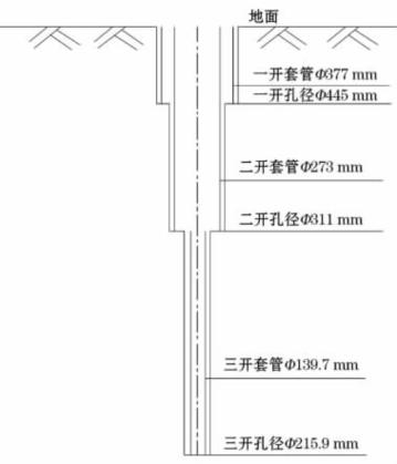 如圖所示,該孔采用三開結(jié)構(gòu),一開0~30m,井徑為445mm;二開30~500m,井徑311mm;三開500~350 m,井徑215.9mm。0~ 30m下入Φ377mm護壁管;0~500m下入Φ273mm套管作為出水管及泵室管;500~3500m下入Φ139.7mm套管作為出水管及濾水管。