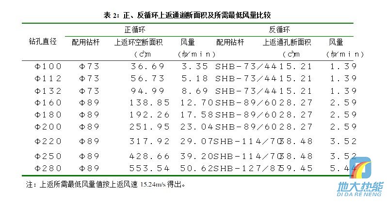 基巖水井通常口徑為Φ160~Φ280mm之間,該口徑硬巖的鉆進(jìn)效率低,成本高,施工周期長,成為鉆探界亟待解決的難題。20世紀(jì)70年代開始,我國已引進(jìn)潛孔錘技術(shù)應(yīng)用于水井鉆鑿,鉆進(jìn)效率數(shù)倍提高,展示了潛孔錘鉆進(jìn)的良好前景。但水井工程,孔深大,背壓高,配套使用的空壓機不但風(fēng)量要求大,風(fēng)太也高,使鉆進(jìn)成本大幅度增高。主要矛盾是滿足排渣屑上返風(fēng)速的要求時,供風(fēng)量巨大,遠(yuǎn)超過了潛孔錘本身工作的需求。計算不同孔徑條件下滿足上返風(fēng)速15m/s供風(fēng)量的需求,見表1(Φ89鉆桿為例)。表1數(shù)據(jù)表明,孔徑越大,為滿足排渣屑要求而消耗的能量越大,經(jīng)濟性越差。若實施反循環(huán)鉆井技術(shù)工藝,則排渣屑所需風(fēng)量大大減小,如表2所示。