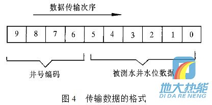 現(xiàn)在通過單片機(jī)輸出控制一組由三極管組成的電子開關(guān),由電子開關(guān)代替按鍵功能完成數(shù)據(jù)輸入.例如:要傳輸十進(jìn)制數(shù)據(jù)0,1,2,3,4,5,6,7,8,9,單片機(jī)依次輸出接通雙音頻編碼器輸入數(shù)字按鍵0,1,2,3,4,5,6,7,8,9對(duì)圖4 傳輸數(shù)據(jù)的格式應(yīng)的電子開關(guān)的控制信號(hào),則該組數(shù)據(jù)經(jīng)雙音多頻編碼器轉(zhuǎn)換為雙音頻信號(hào). 雙音多頻編碼器在單片機(jī)控制下,定時(shí)“撥通”水位監(jiān)測(cè)中心電話號(hào)碼,在水位監(jiān)測(cè)中心計(jì)算機(jī)應(yīng)答并“摘機(jī)”的情況下,通過這條已接通的電話線路,將所測(cè)的水位數(shù)據(jù),經(jīng) 過雙音多頻編碼器編碼后傳送到監(jiān)控中心. 要傳輸?shù)臄?shù)據(jù)格式為:數(shù)據(jù)長度為10位十進(jìn)制數(shù),其中高四位為井號(hào)編碼,低六位為所測(cè)量的水井水位數(shù)據(jù),水位數(shù)據(jù)分整數(shù)和小數(shù)兩部分.數(shù)據(jù)傳輸?shù)姆较蚴菑母呶坏降孜?數(shù)據(jù)格式如圖4所示.