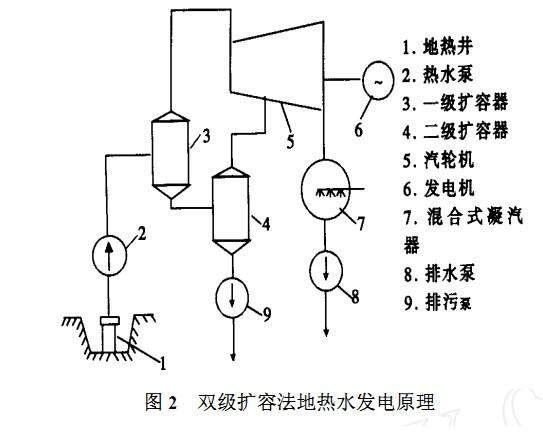 西南電力設(shè)計(jì)院設(shè)計(jì)的羊八井地?zé)?/a>電站第1臺試驗(yàn)機(jī)組,容量為1000kW,汽輪機(jī)是利用四川內(nèi)江電廠2500kW廢棄設(shè)備改造而成。于1977年10月試運(yùn)成功,采用單級擴(kuò)容法熱力系統(tǒng)。若把地?zé)崴?/a>送入1個密閉的容器中降壓、擴(kuò)容,根據(jù)水沸點(diǎn)與壓力的關(guān)系,可使溫度不太高的地?zé)?/a>水因氣壓降低而沸騰變成蒸汽。由于地?zé)?/a>水降壓蒸發(fā)的速度很快,是一種閃急蒸發(fā)過程;同時,地?zé)崴?/a>蒸發(fā)產(chǎn)生蒸汽時,其體積迅速擴(kuò)大,所以該容器稱為“擴(kuò)容器”或“閃蒸器”。用這種方法產(chǎn)生蒸汽來發(fā)電稱為擴(kuò)容法地?zé)崴?/a>發(fā)電。這是利用地?zé)崽?/a>熱水發(fā)電的主要方式之一,該方式分單級擴(kuò)容法系統(tǒng)和雙級(或多級)擴(kuò)容法系統(tǒng)。擴(kuò)容法系統(tǒng)的原理是:將地?zé)峋?/a>來的中溫地?zé)?/a>汽、水混合物,先送到擴(kuò)容器中進(jìn)行降壓、擴(kuò)容(稱閃蒸),使其產(chǎn)生部分蒸汽,蒸汽經(jīng)過分離器除去雜質(zhì)(10μm及以上)后,再引到常規(guī)汽輪機(jī)機(jī)發(fā)電。